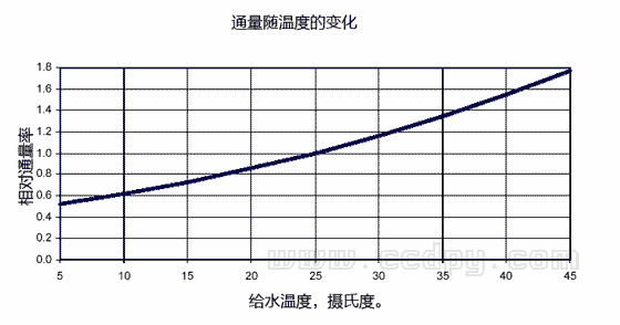 溫度對(duì)反滲透膜產(chǎn)水量的影響如下圖所示。溫度變低,水的粘度增加,水的擴(kuò)散性減弱,產(chǎn)水量也隨著溫度下降而降低。在同一壓力下,溫度下降一攝氏度,產(chǎn)水量可減小3~4%。下列方程是產(chǎn)水通量隨溫度變化的關(guān)系。